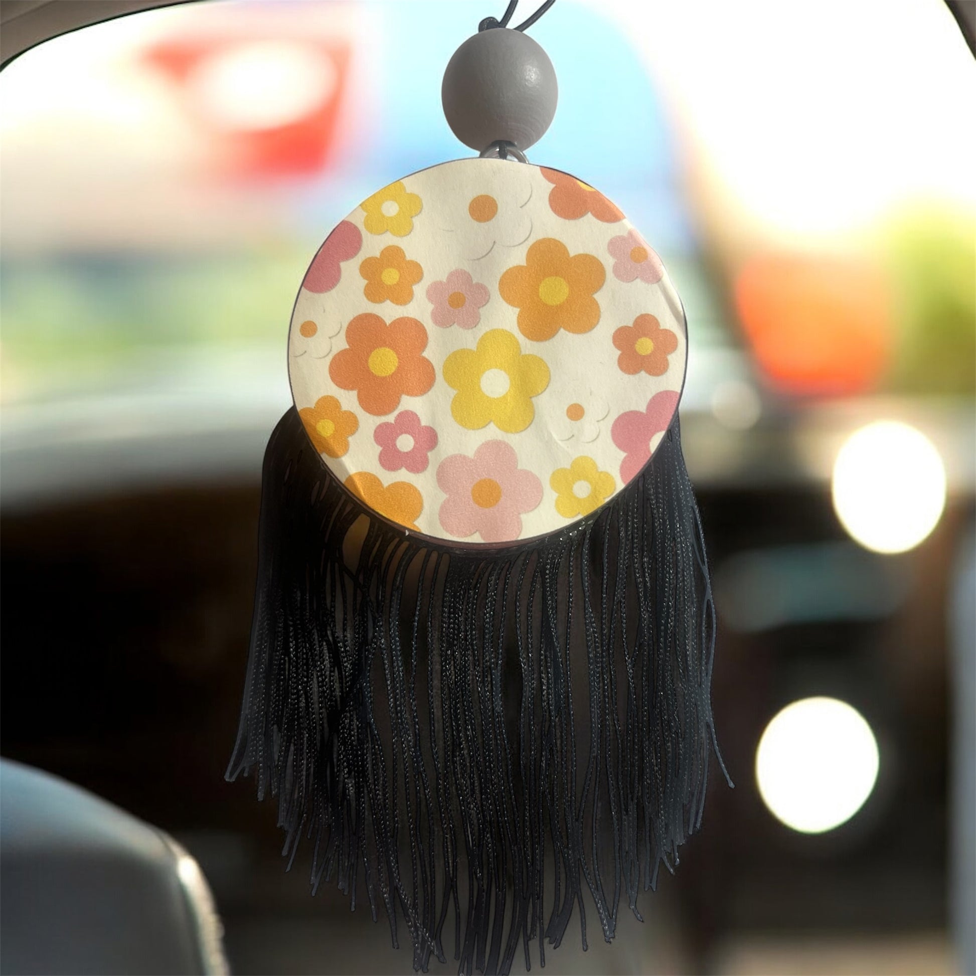 3 inch Circle freshie in pink with silver bead and black fringe in Coconut Lime Verbena. Coconut Lime Verbena - A creamy blend of coconut, tangy lime with hints of verbena, vanilla and musk.