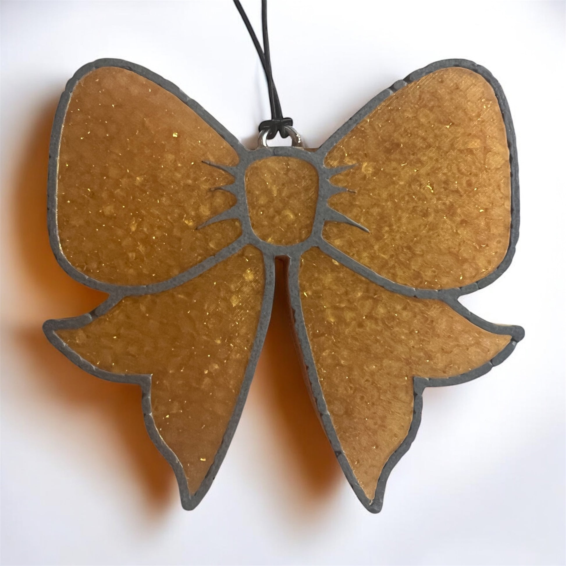 Bow freshie in gold with silver detail in A Thousand Wishes. A Thousand Wishes - A festive blend of pink prosecco, sparkling quince, crystal peonies, gilded amber & amaretto crème. (Our Version of the Bath and Body Works Fragrance)