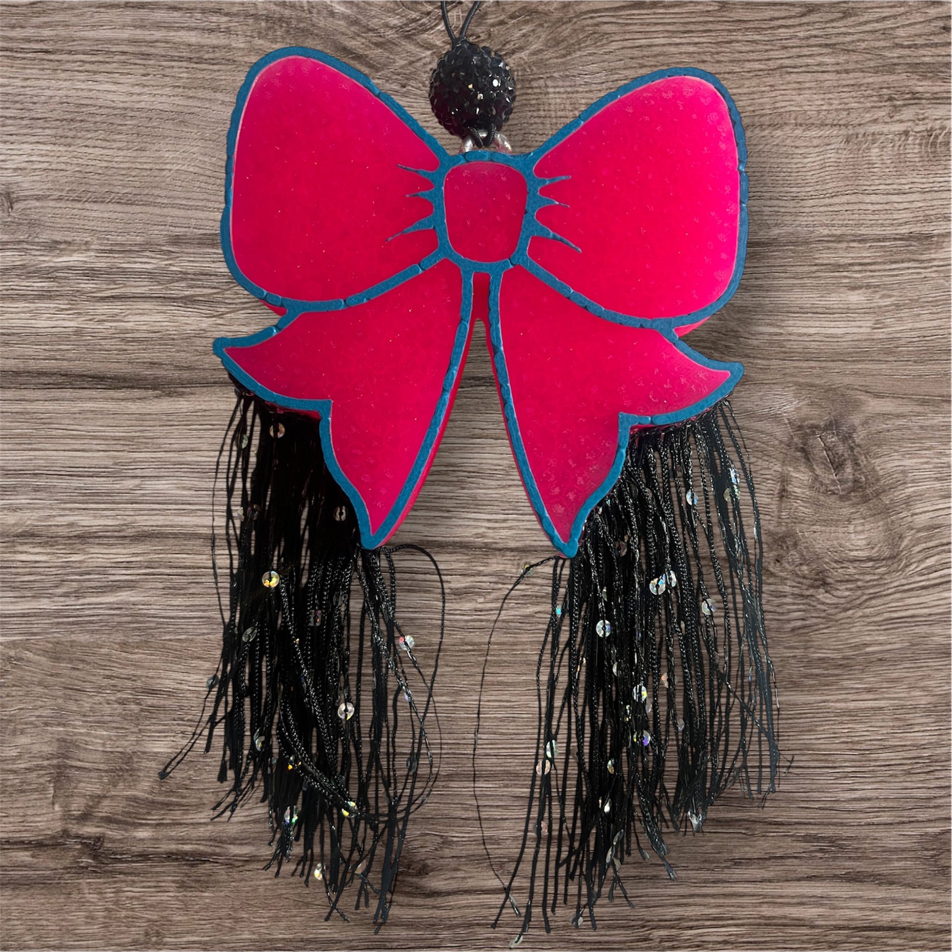 Bow freshie in pink with turquoise detail, black rhinestone bead, and black sequin fringe in sweet grace. Sweet Grace - Full-bodied passionfruit and apricot embrace the heart-warming aromas of sparkling tea, vanilla, caramel, chocolate and patchouli for a heaven sent fragrance formula.