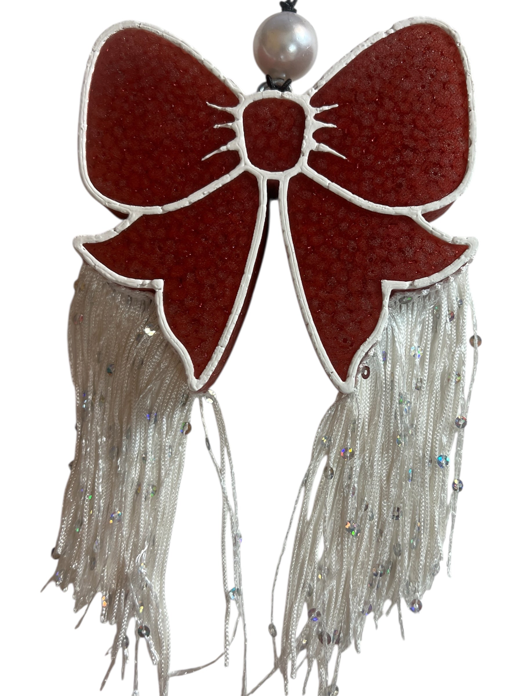 Bow freshie in red with white detail, white bead, and white sequin fringe in Winter Candy Apple Scent. Winter Candy Apple- BBW Type. An irresistible blend of candied apple and orange zest, with notes of winter rose petals, cinnamon, oak moss, orris and winter musk.
