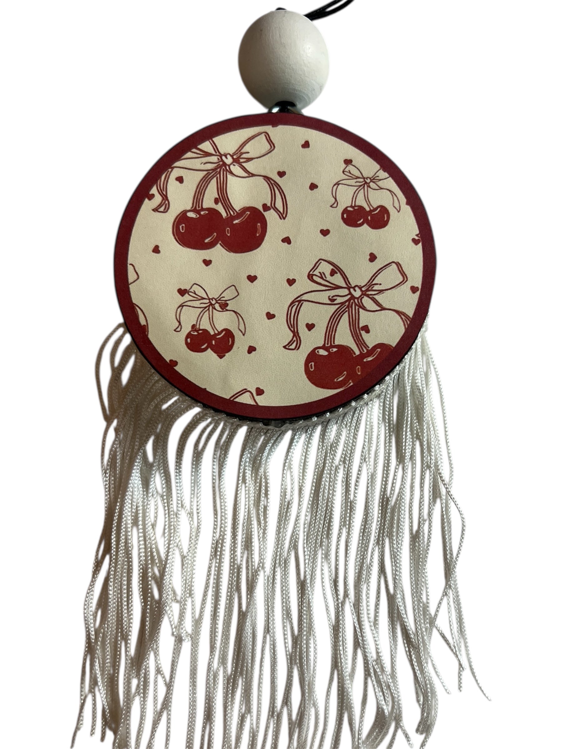 3 inch Circle freshie in black with white bead and white fringe in butt naked. Butt Naked Fragrance Oil - A fruity bouquet with strawberry, banana, peach and melon top notes with sweet lactony background.