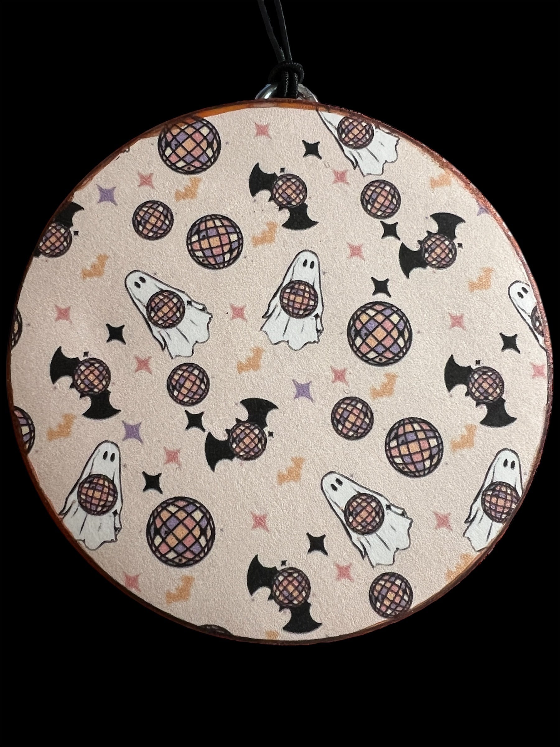 3 inch Circle freshie in copper in Hocus Pocus Scent. Hocus Pocus - A rich and spicy fragrance combining fresh pumpkin with creamy coconut alongside warm spicy notes of cassia and clove, all resting on a decadent base of maple, precious woods and smoky bourbon.
