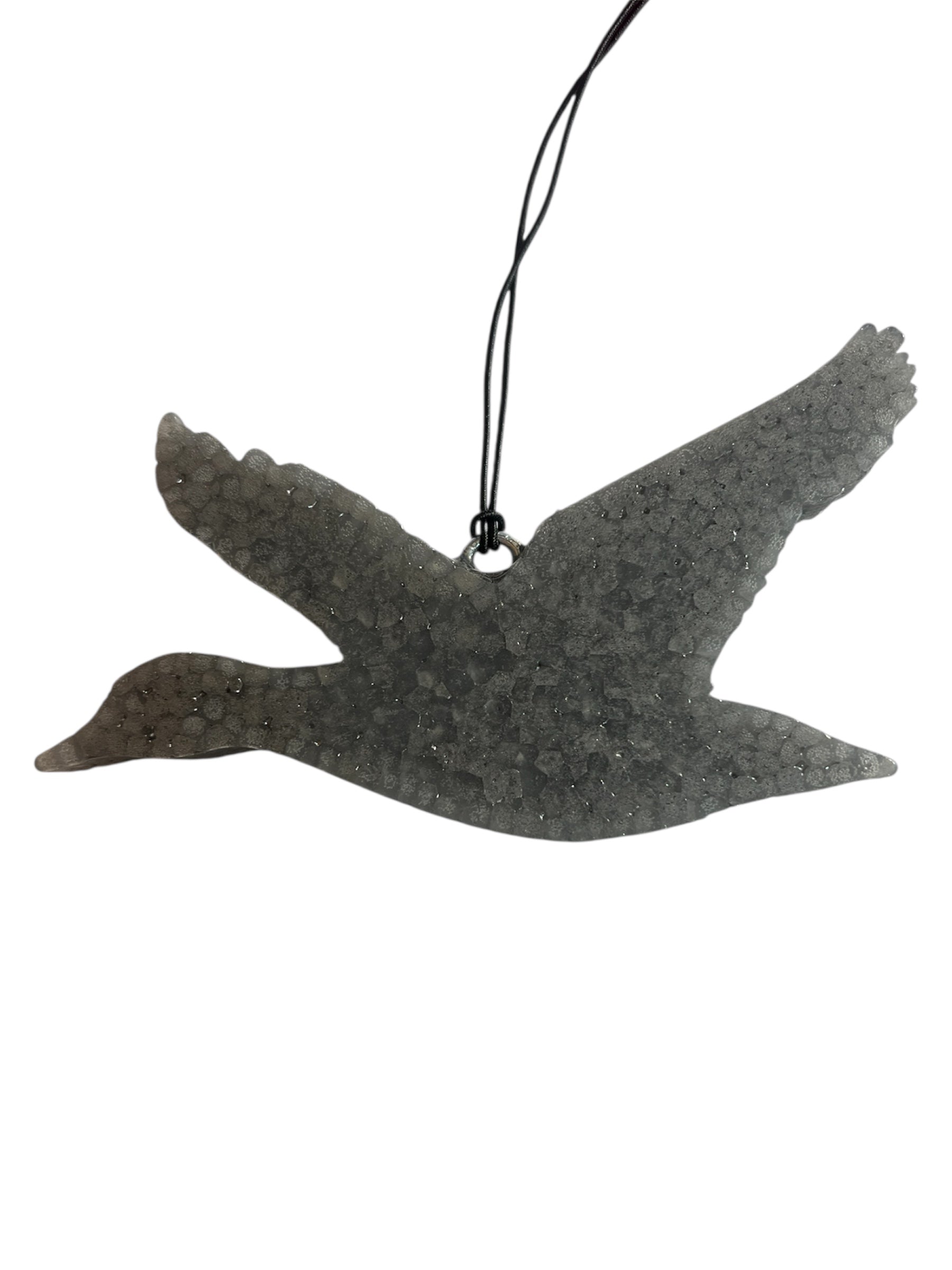 Flying Duck freshie in grey in Black Ice Scent. Black Ice Scent: A masculine and clean fragrance with a touch of musky, mossy, woodsy, and ambergis subtle florals.Our freshies are double baked for thickness and longer lasting scent. Our eye screws are cemented in to keep from falling out in those higher temps.