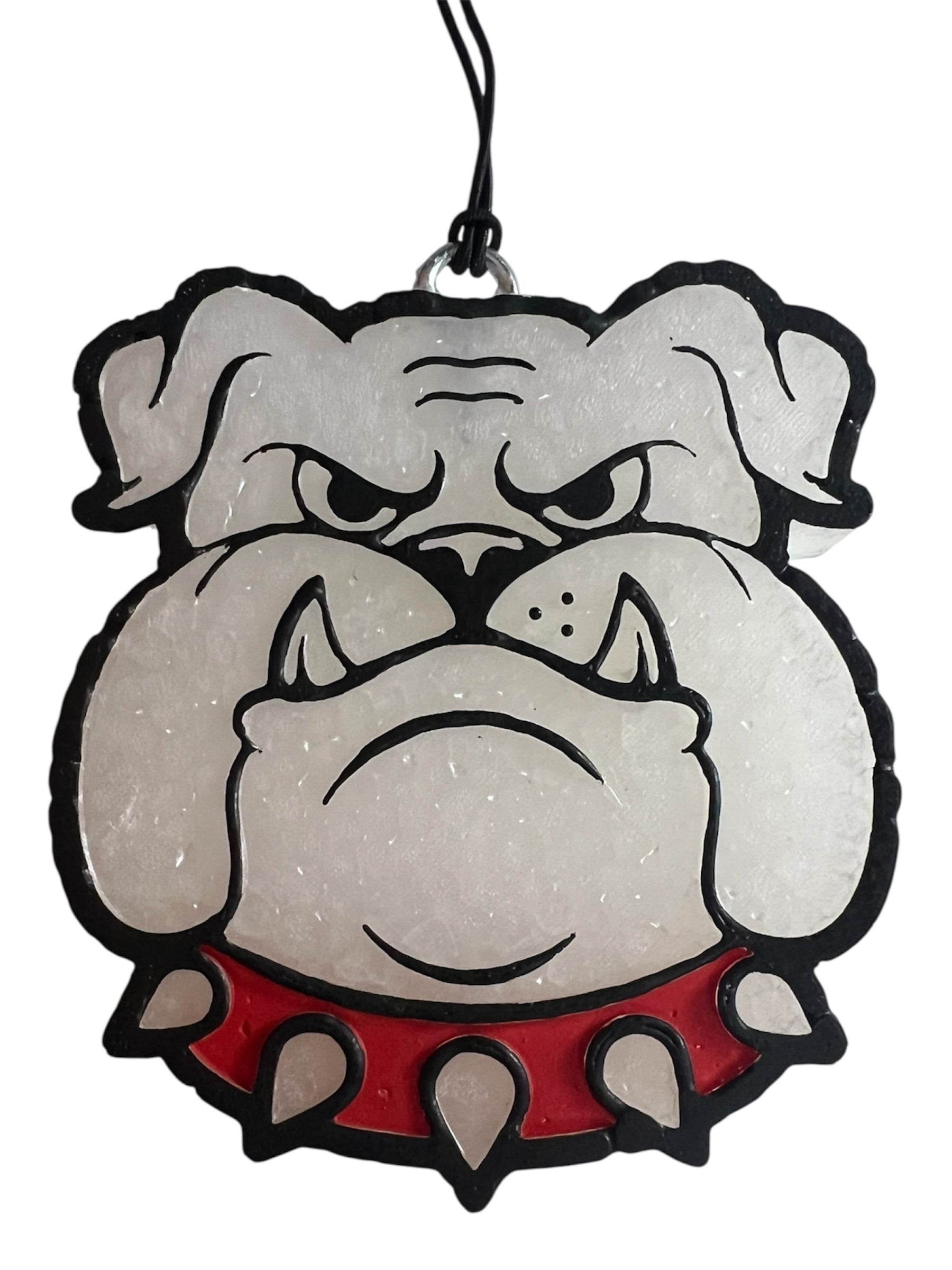 Georgia Bulldog Freshie in white with red/black detail in Black Ice Scent. Black Ice Scent: A masculine and clean fragrance with a touch of musky, mossy, woodsy, and ambergis subtle florals.