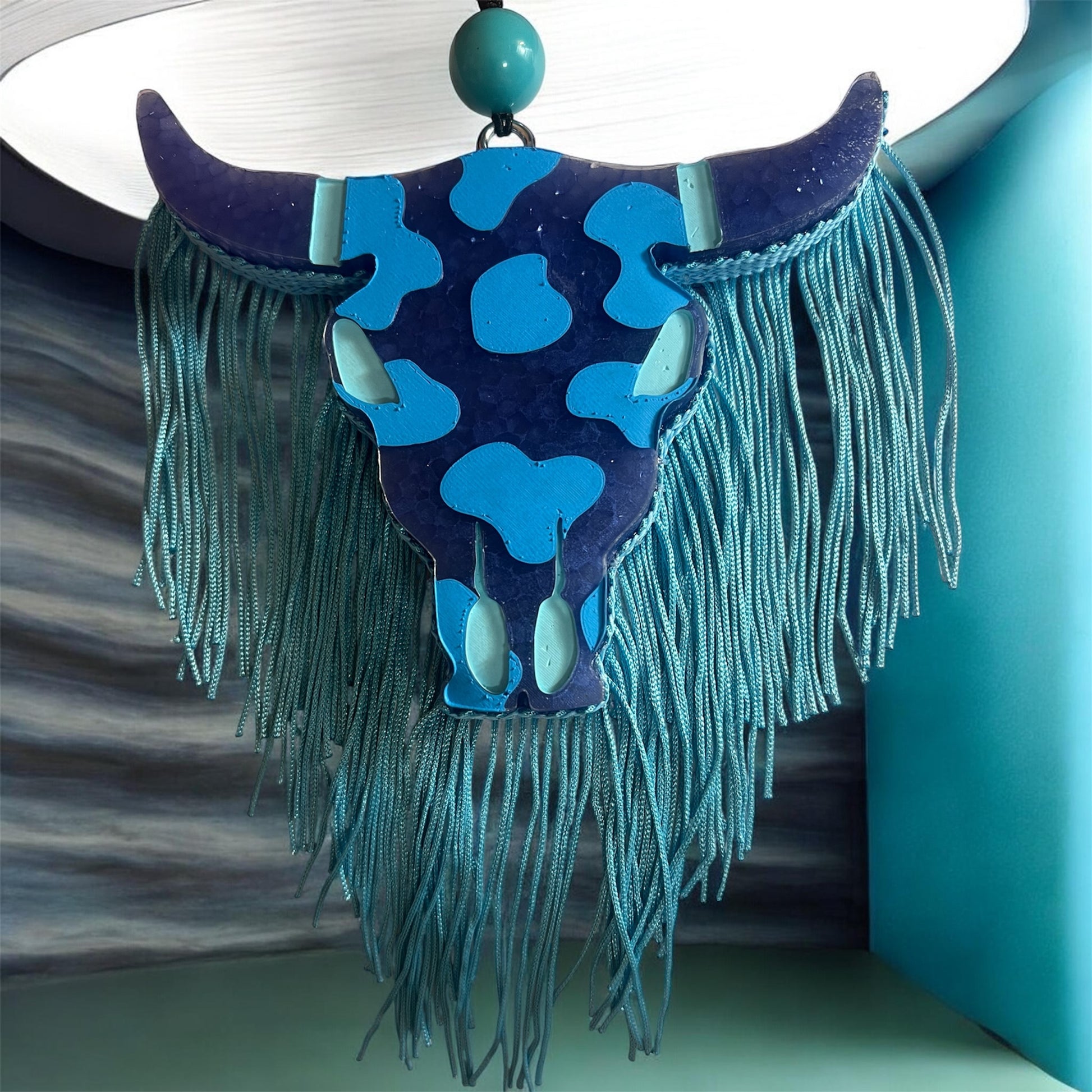 Large Longhorn Freshie in violet with blue detail, blue bead, and blue fringe in Fruit Loops. Fruit Loops - Smells just like you opened the box of Fruit Loops.