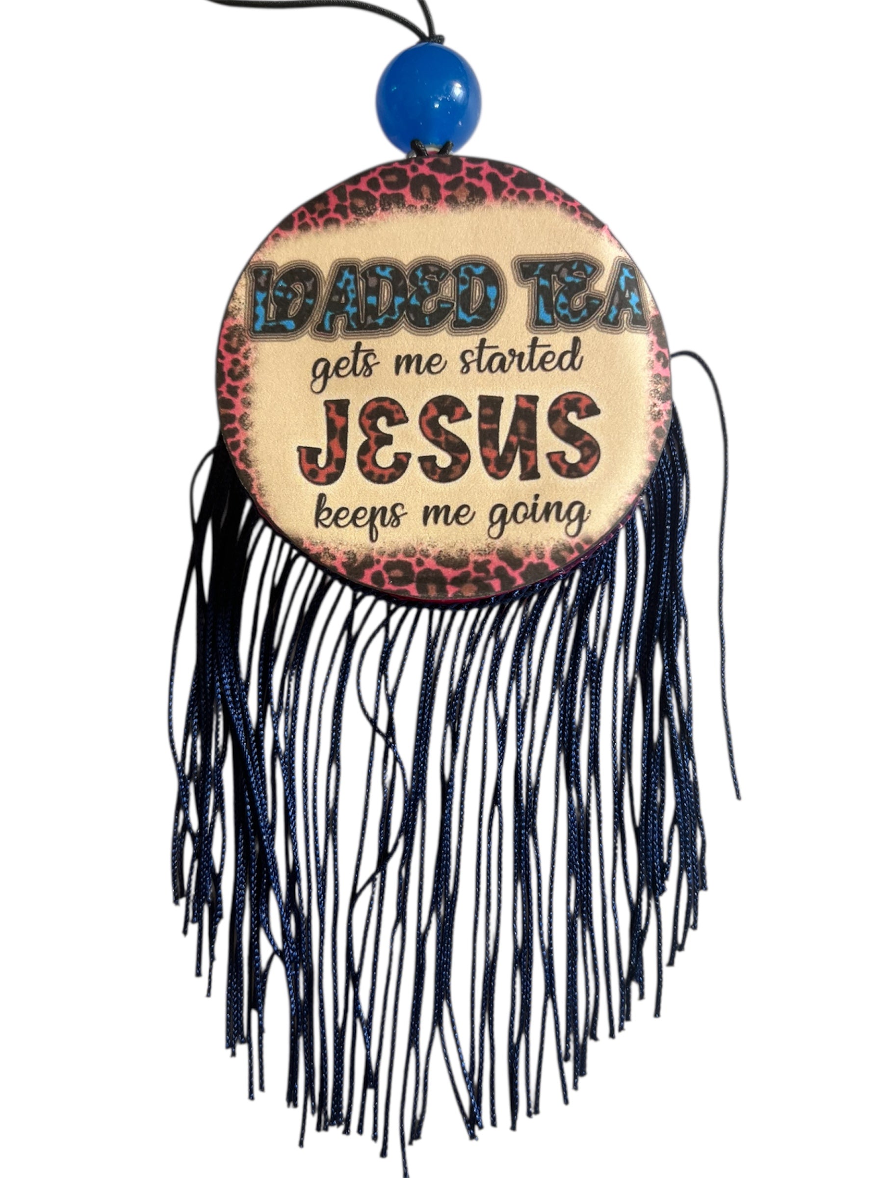 3 inch Circle freshie in pink with blue bead and blue fringe in Black Ice Scent. Black Ice Scent: A masculine and clean fragrance with a touch of musky, mossy, woodsy, and ambergis subtle florals.