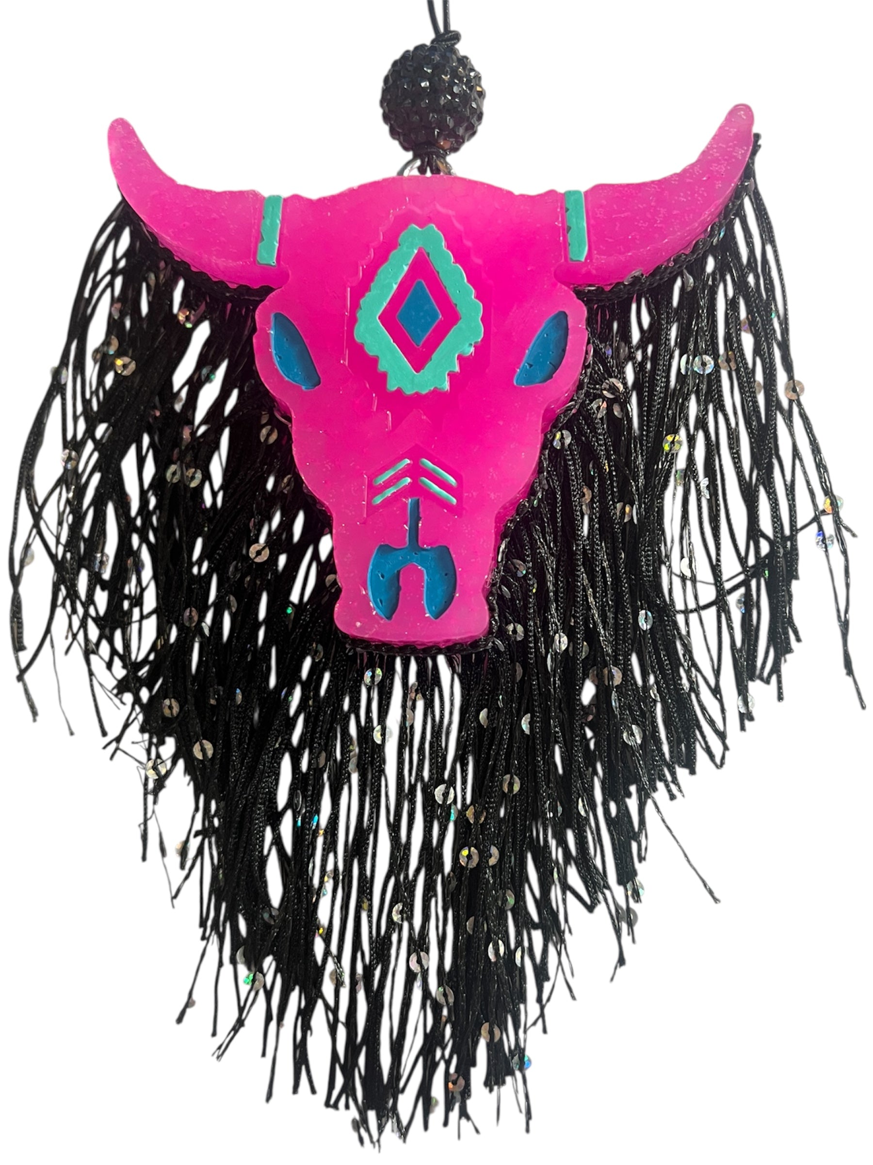 Longhorn in pink with teal/aquamarine detail, black sequin fringe, and black rhinestone bead in butt naked. Butt Naked Fragrance Oil - A fruity bouquet with strawberry, banana, peach and melon top notes with sweet lactony background.