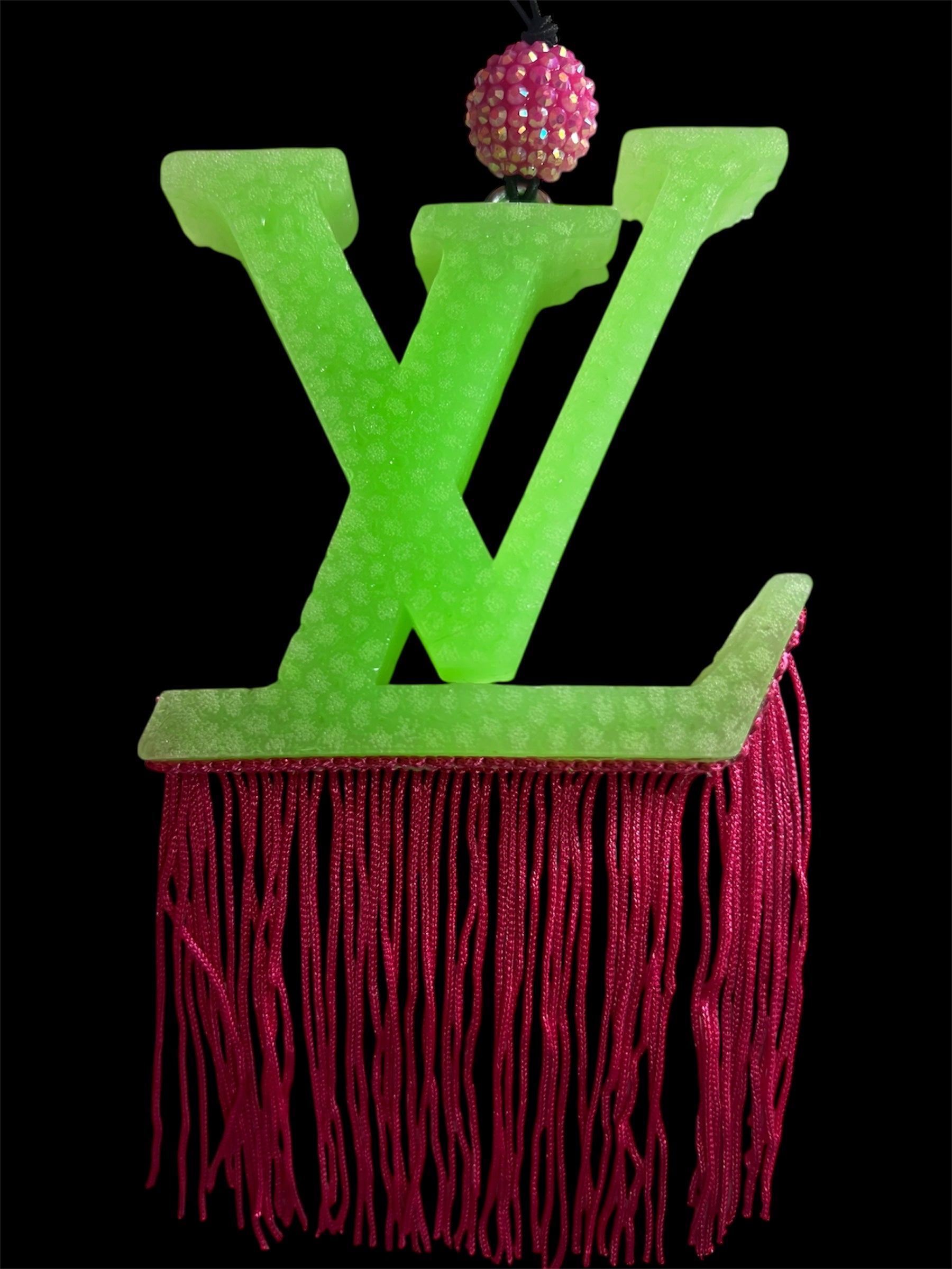 "LV" in glow in the dark green with pink rhinestone bead and pink fringe in Sauvage Dior. Sauvage Dior - A bit of citrus with bergamot lily of the valley and lavender