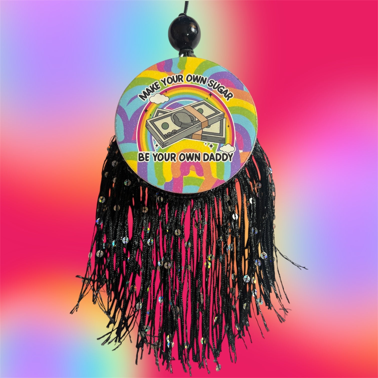 3 in circle in crimson/red with black bead and black sequin fringe in Caribbean Dream Scent. Caribbean Dream - A sweet fragrance of tropical fruits and berries.