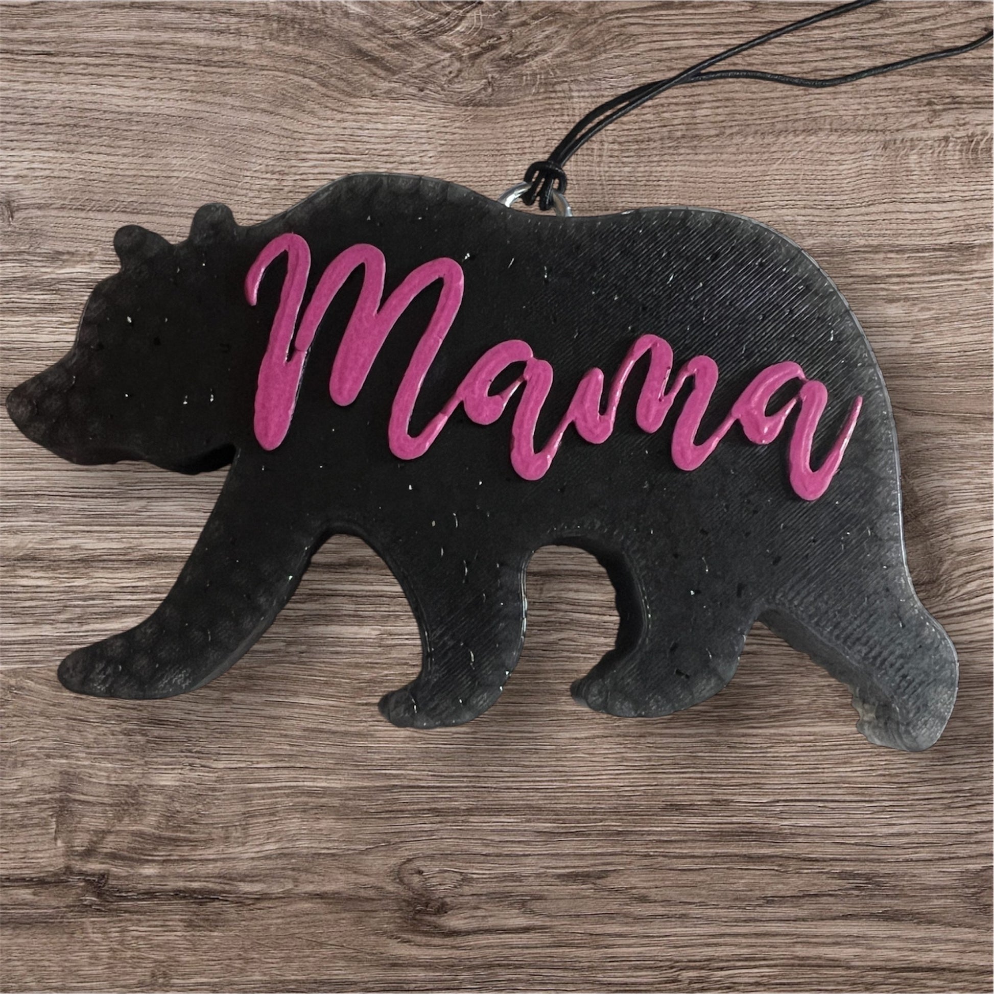 Mama Bear freshie in black with pink detail in Love Spell scent. Love Spell Scent: Sweet citrus bouquet enhanced by hints of peaches and berries on a background of musk. Inspired by Victoria's Secret scent.