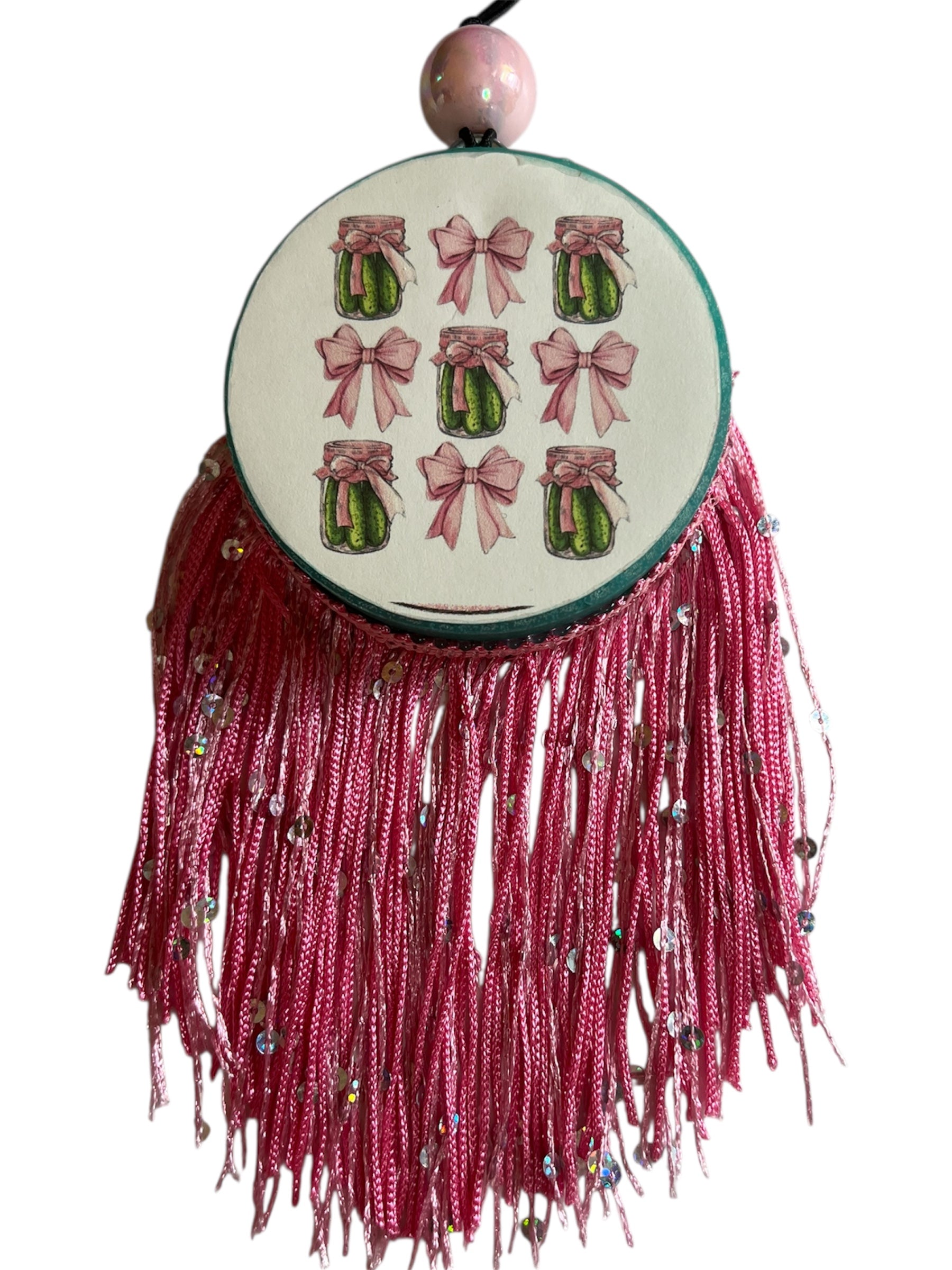 3 inch Circle freshie in teal with pink sequin fringe and pink bead in Volcano scent. Same great fragrance...new name. A delightful blend of tropical fruits and sugared oranges, lemons and limes with hints of exotic tropical florals and mountain greens.