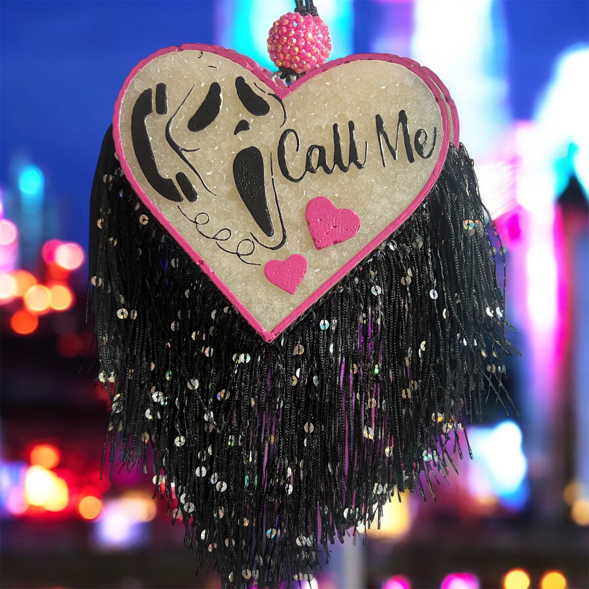 Scream Freshie in white with pink/black detail, pink rhinestone bead, and black sequin fringe in Hocus Pocus Scent. Hocus Pocus - A rich and spicy fragrance combining fresh pumpkin with creamy coconut alongside warm spicy notes of cassia and clove, all resting on a decadent base of maple, precious woods and smoky bourbon.