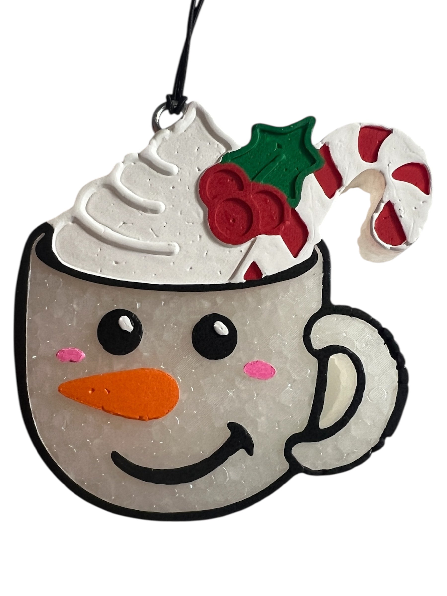 Snowman Mug Freshie in white with red/green/black/orange/pink detail in Winter Candy Apple Scent. Winter Candy Apple- BBW Type. An irresistible blend of candied apple and orange zest, with notes of winter rose petals, cinnamon, oak moss, orris and winter musk.
