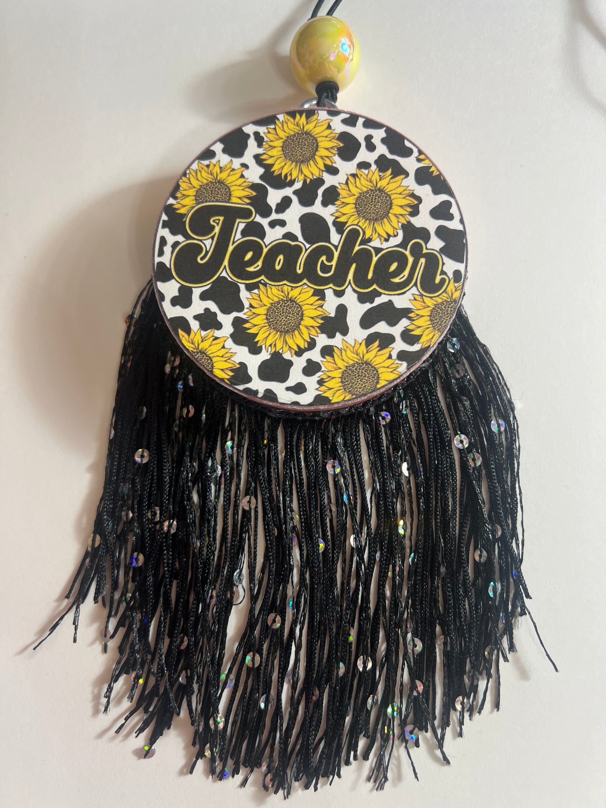 3 inch Circle freshie in pink with black sequin fringe and yellow bead in Strawberry Lemonade scent. Strawberry Lemonade - A tart lemonade blended with sweet strawberries.